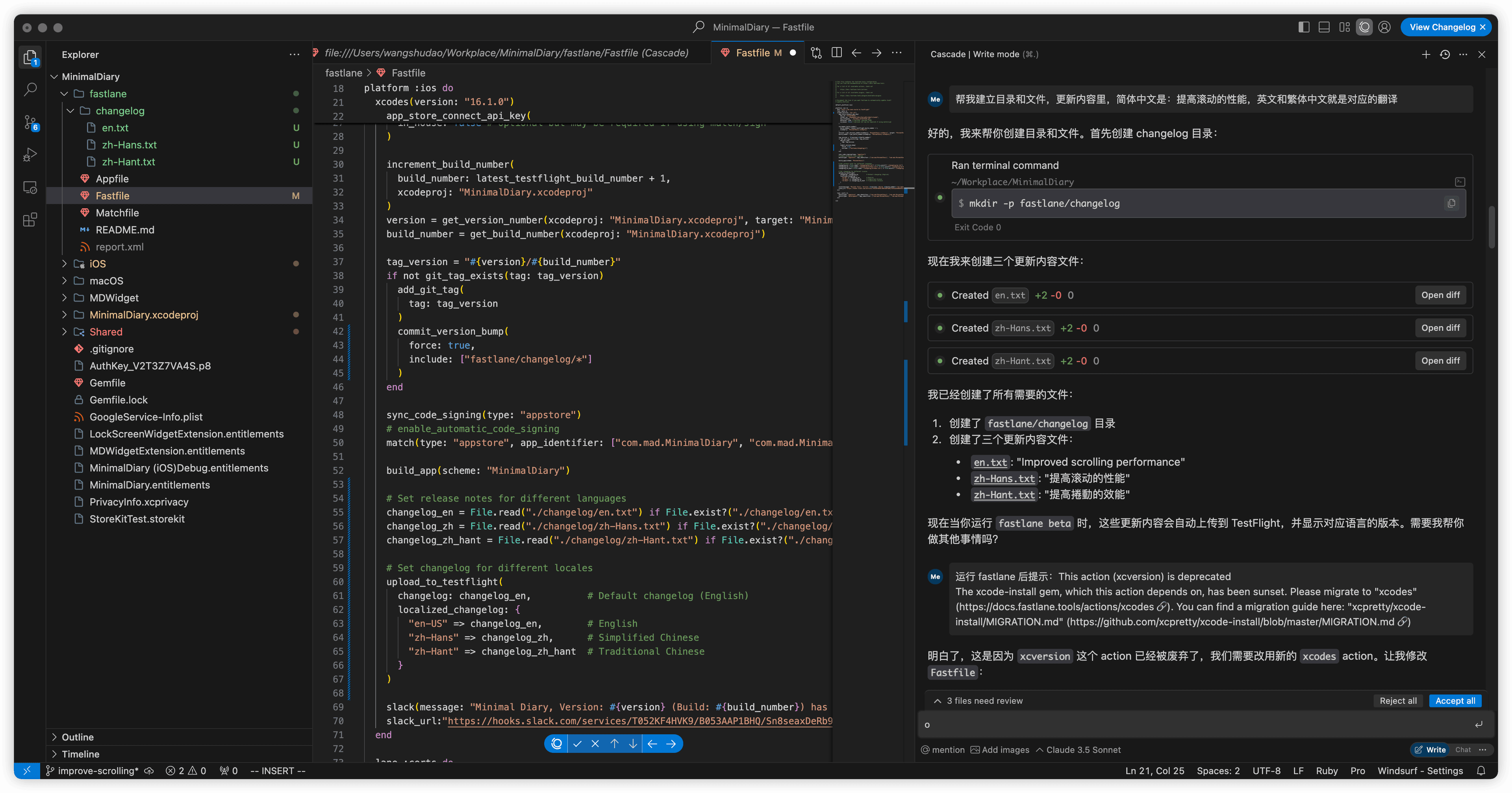 之前每次发新版本,app 内的 changelog 和 Connect 后台里的release note 我都要反复切换各种语言和网页去复制粘贴,这次我让 Windsurf 解决了这个问题。fastlane 可以直接提交多语言的 release note 到 Connect,我又让 app 内的 changelog 根据系统语言直接读取对应的本地化字符串,这样就只需要维护各个语言的本地化字符串就可以了,省去了很多人工工作。Windsurf 虽然不善于大量文本的本地化,但是翻译更新日志这点文字还是绰绰有余的。