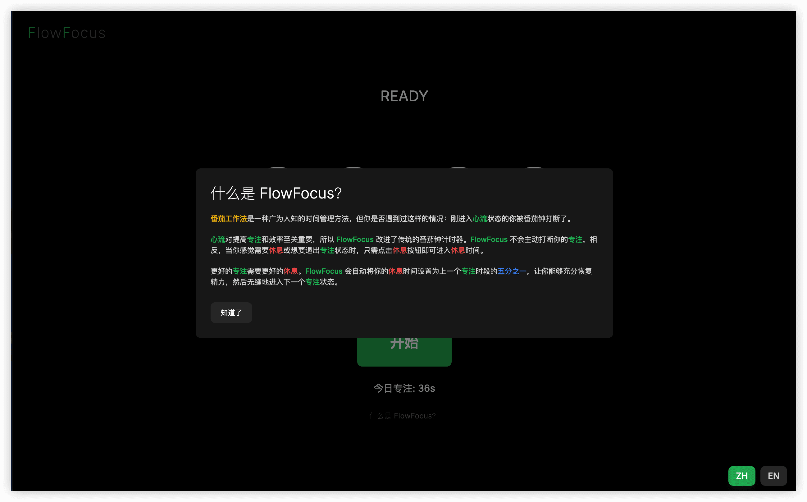 番茄钟已经烂大街了,我就想着能不能搞点特殊功能和设计,然后我就发现了有一个和番茄工作法相关的另一个时间管理法,叫做 Flowdoro(Flow+Pomodoro),原理就是自己掌控专注时长,休息时间是专注时间的五分之一。番茄钟是倒计时,而这个是正计时,所以它不会主动打断你的心流状态,只有你觉得累了或者从心流状态中走出来就可以主动进入休息状态。这样你会找到更适合你自己的专注和休息节奏,不会像番茄钟那样被固定的倒计时打乱心流。