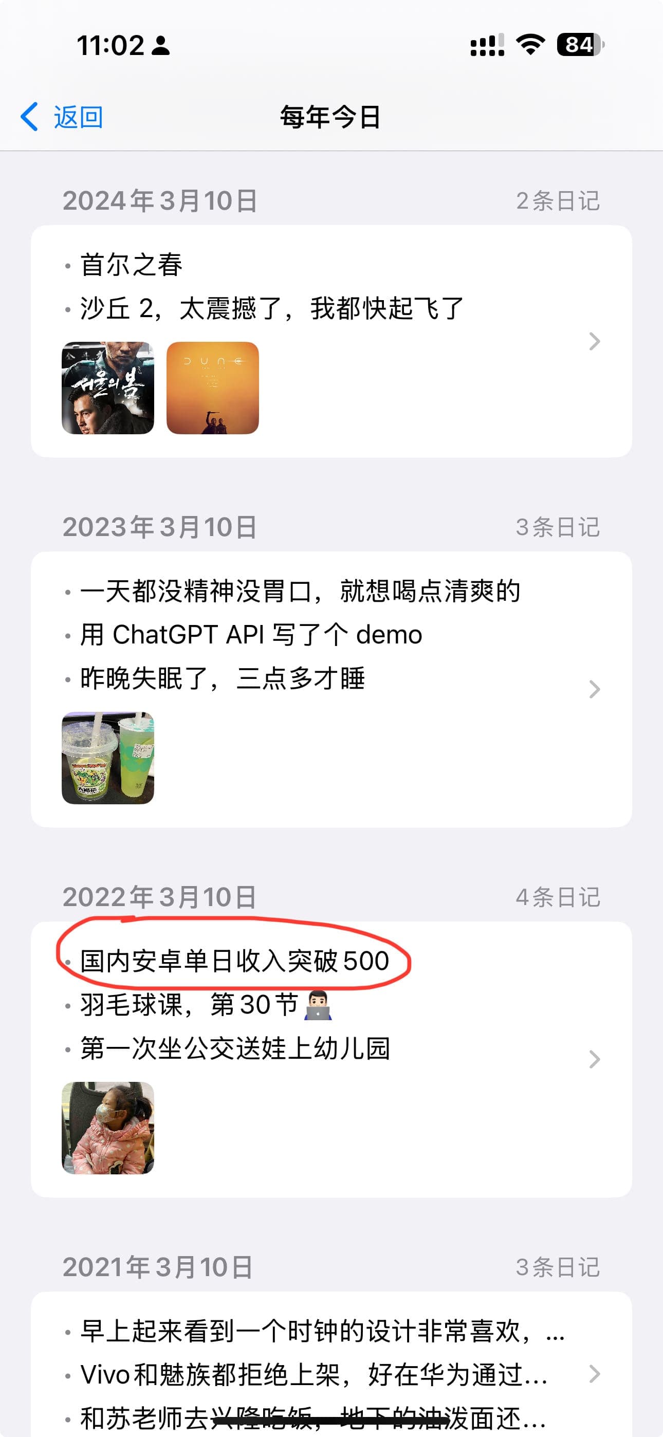 平日里,国内安卓市场一天的收入也就是 200 左右,好一点的话能四五百,最高记录是八百,正好通过「每年今日」翻到了三年前的一个记录。