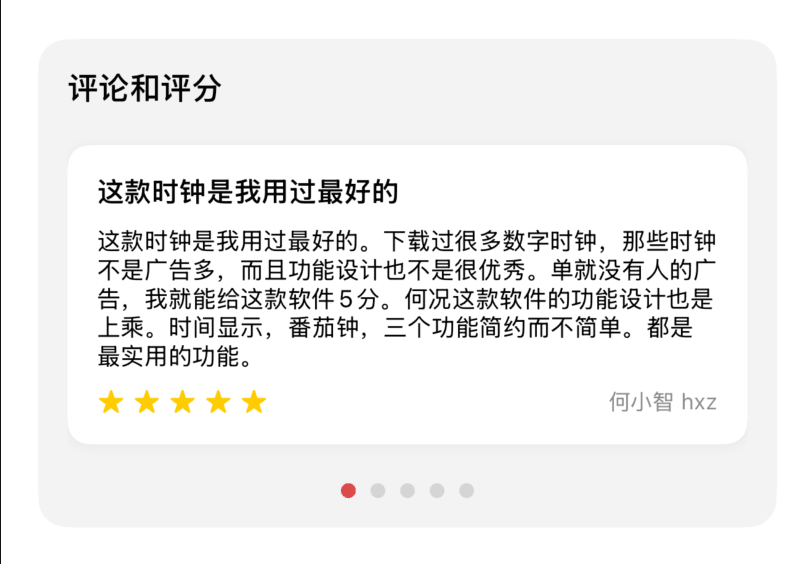 这些用户评价都是 App Store 里的,但不是动态读取的,都是硬编码在 App 里的(当然选的都是五星评价啦)。一开始我还想每个支持的语言版本里都挑出五个来滚动展示,但是最终发现除了简体中文和英文,其他语言根本没有那么多评价,更别提适合满足的五星评价了,所以最终就只加入了简体中文和英文这两种。