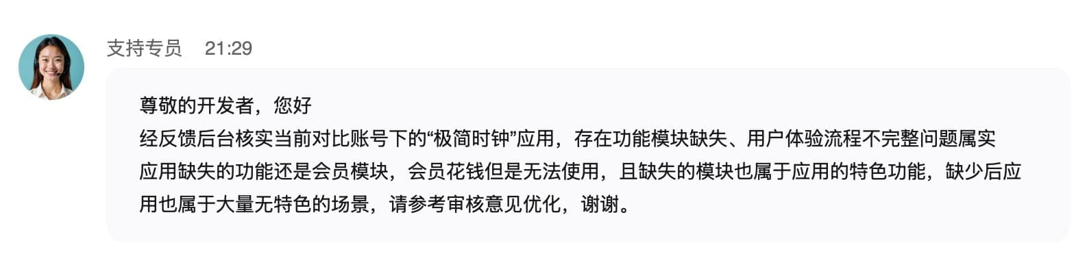 几个开发者劝我别放弃,让我去申诉,并且说附上极简时钟在其他平台的下载量可能会对审核有帮助。作为最后一次尝试,我照做了,结果申诉失败。