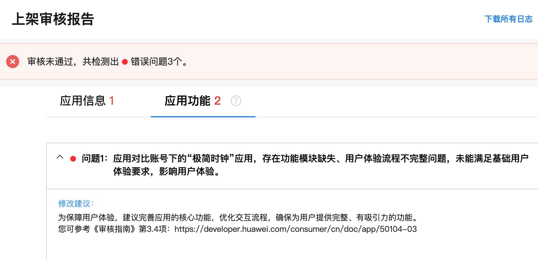 总之,鸿蒙的审核要求是鸿蒙版必须和安卓版一比一复刻才可以。我又小修小改了几个地方,又提交了一版,并且附上了备注,就是上面那些对于所谓的缺失功能的解释。第二次审核足足审了 48 小时,结果还是未通过审核。我本来以为极简时钟作为成熟应用会很容易上架,没想到偏偏是因为已经有了安卓版,才导致审核不通过。可如果之前没有上架安卓版,估计还会以 3.5 被拒绝,两头堵,总之是没戏了。