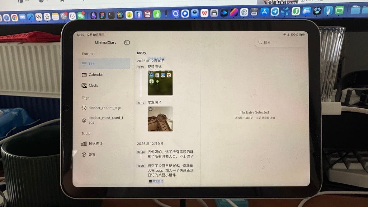 这周的真正开发都在继续做极简日记的 iPad/Mac 版。AI 搞定了日记列表的无限滚动显示,但是在重构编辑器上遇到了一些困难。对于编辑器里的输入交互,我改了又改,还是不满意,参考了几个其他日记笔记类的 App,也都不适合极简日记。