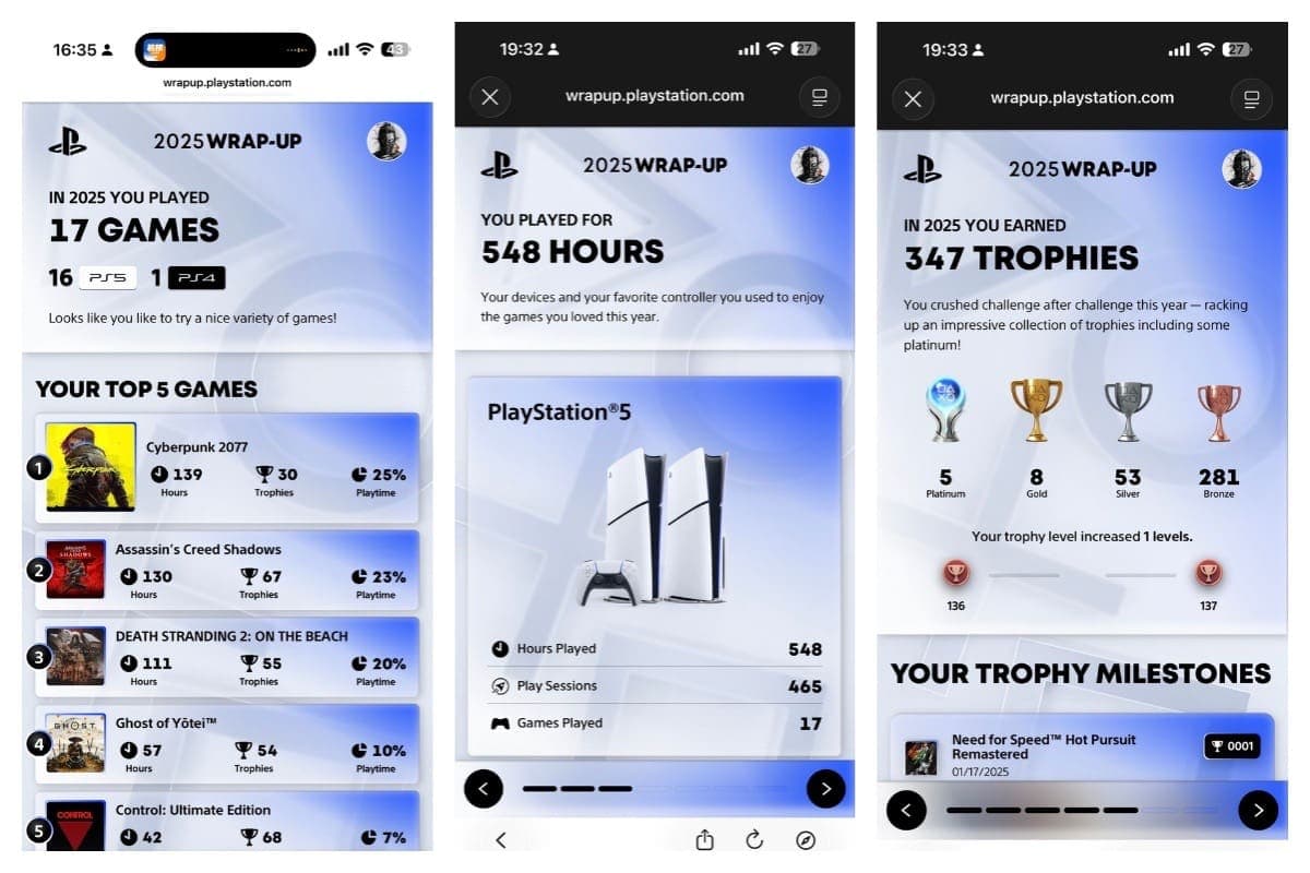 548 小时,接近 23 天,这是我今年花在 PS5 上的时间。一共获得 5 个白金,就是图里的 top 5 游戏。