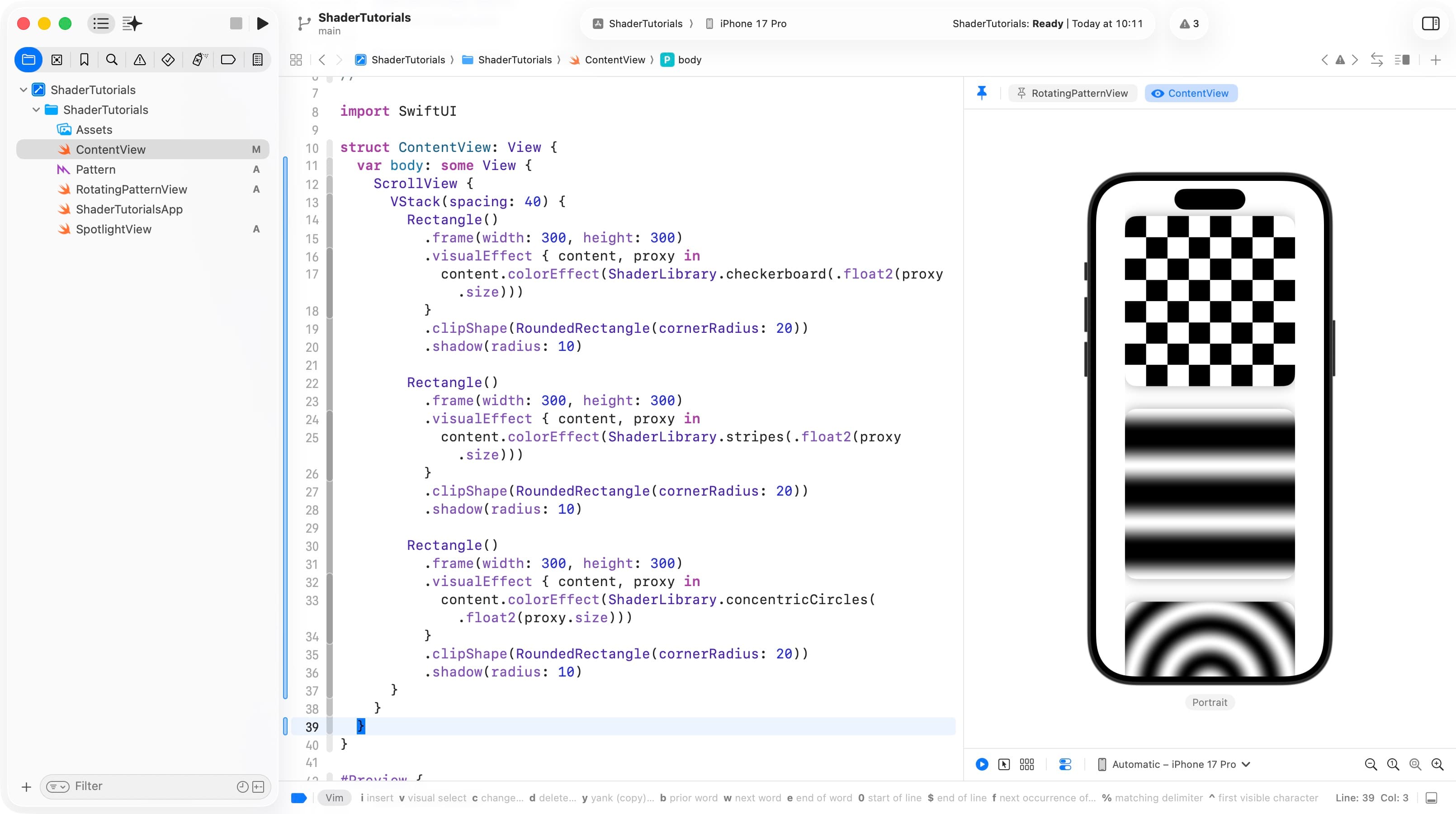 之前收藏了一个叫做 Metal Shaders for SwiftUI 的免费教程,这周学习了两天,跟着一点点一行行手敲代码。SwiftUI 里针对 Shader 的修饰符有三个:.colorEffect、.distortionEffect、.layerEffect,这两天只学习了 .colorEffect,就是关于颜色的变换。