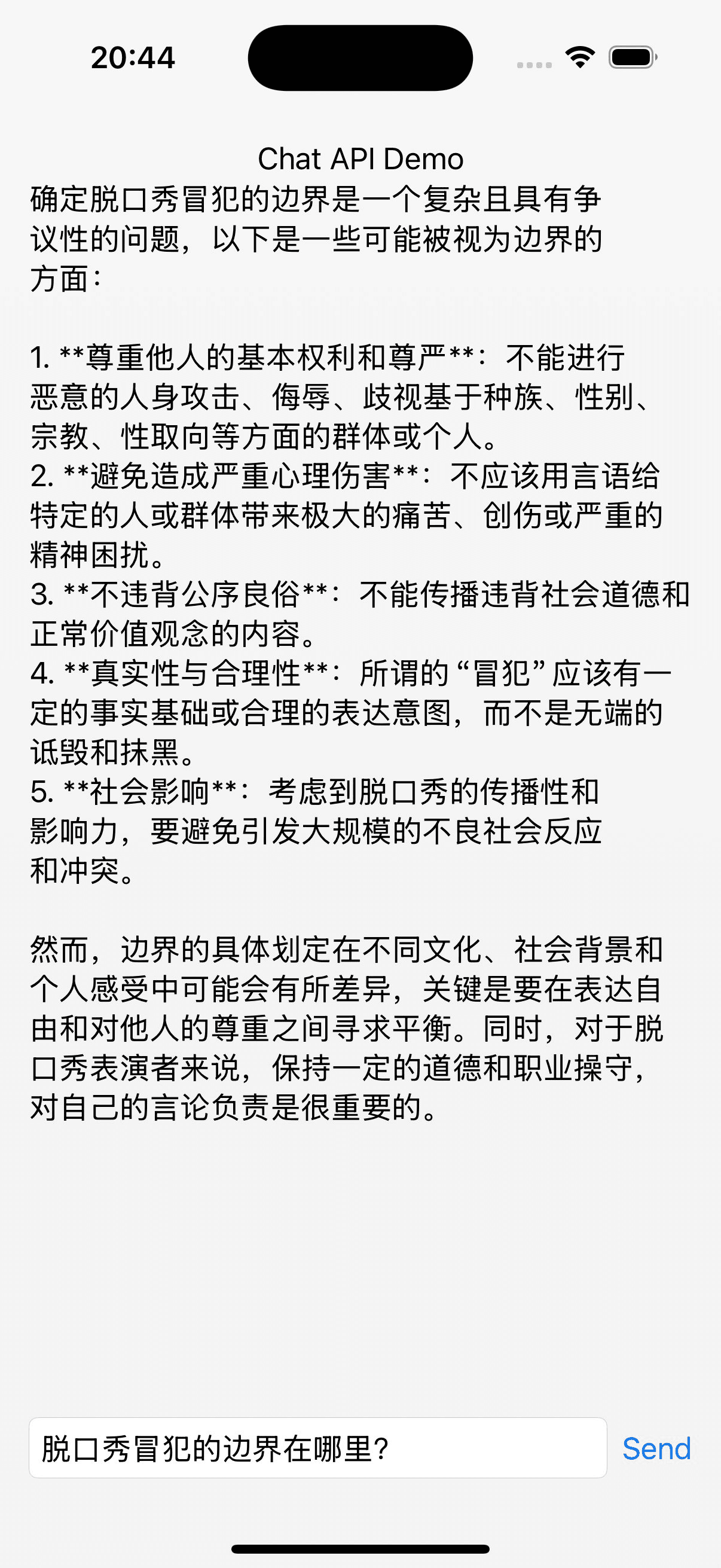豆包文档里说 API 参数和 OpenAI 的兼容,但是我试了四个 Github 上 Swift 的 OpenAI SDK,结果都不行。原因是豆包 API 是 v3,而 OpenAI API 是 v1,请求 path 就不一样,所以这些 SDK 封装好的 API 也都用不了。最后还是靠 URLSession 和让 GPT 根据文档的响应格式生成的 Response 结构体跑通了调用流程。