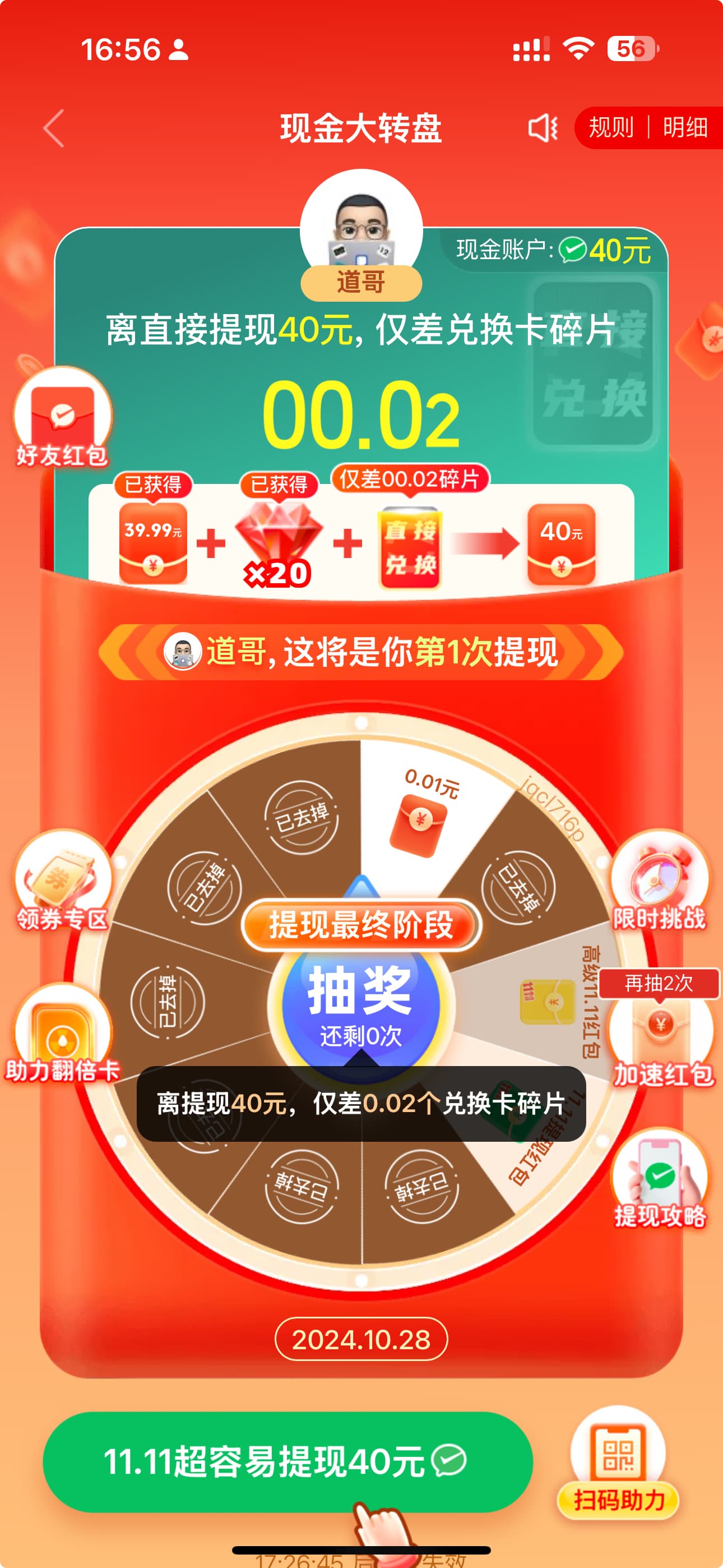 集齐了 20 个钻石就能提现了吗,天真!接下来需要一张「兑换券」才可以提现,但是这个兑换券需要集齐四张碎片。前两张碎片第一次抽奖就能得到,第三张碎片需要抽几次才可以,而最后一张碎片,每次抽奖只能得到 1%~5%,总进度也就是无限接近 99.99%……最后我还是放弃了,体验终止。