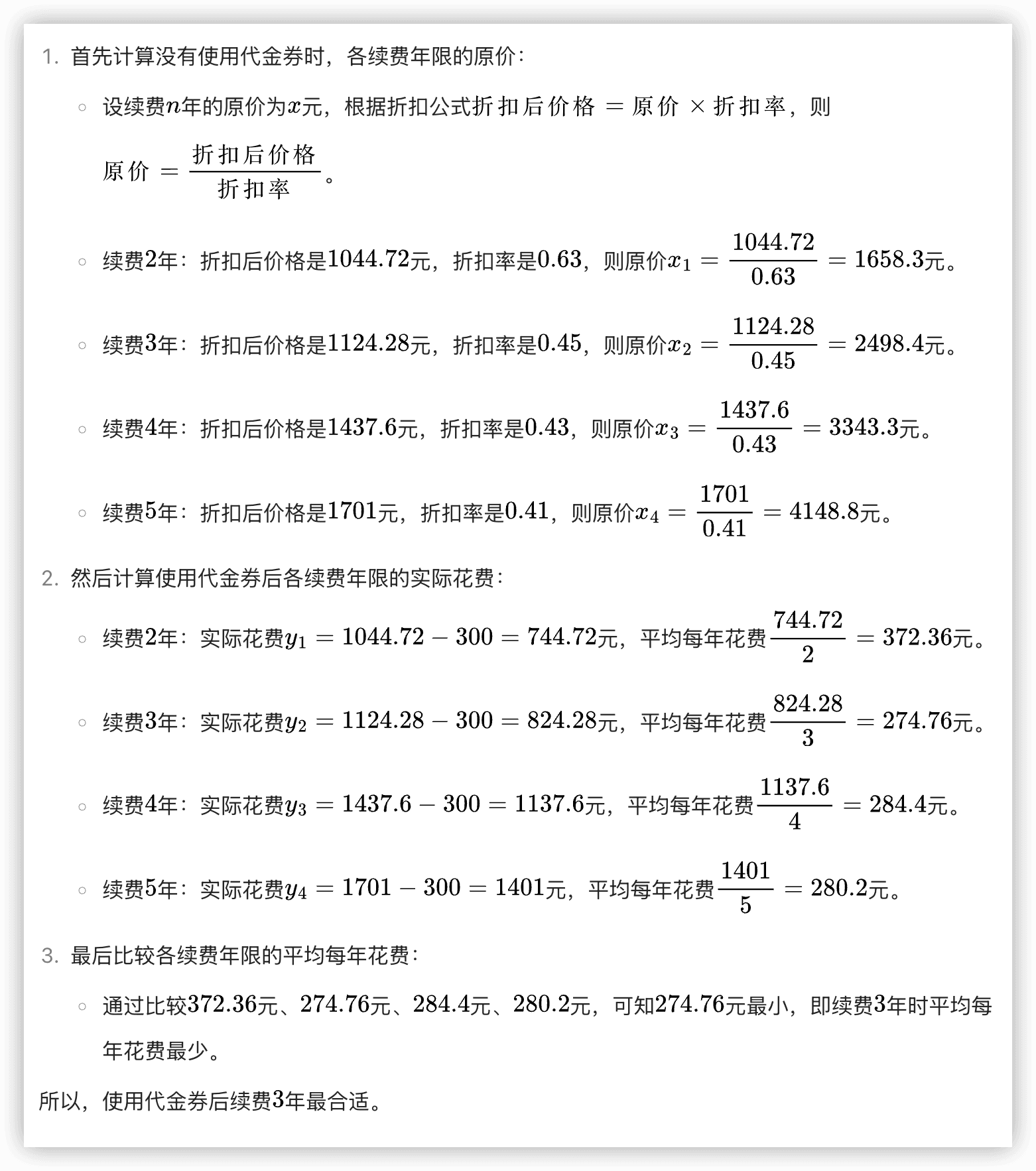 尽管不能参加优惠活动,但是拿了一张 300 元的代金券,于是把各种续费价格输入给 AI,让 AI 帮我选一个最佳的方案。结果是 3 年,和我的第一感觉也是一致的。我没仔细检查 AI 的计算过程和结果,就无脑相信了,反正大差不差。