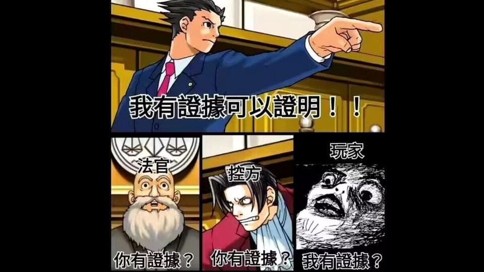 通关了这个系列游戏的第一部,包括《复苏的逆转》。这个五个案件的游戏时间就像斐波那契数列一样,越来越多,而且案情越来越复杂。最后一个案件,有两次剧情无法推进,不得不查了攻略。从第三个案件开始就不断使用 S/L 大法,不然总是举证失败,就跟下面这张图一模一样。