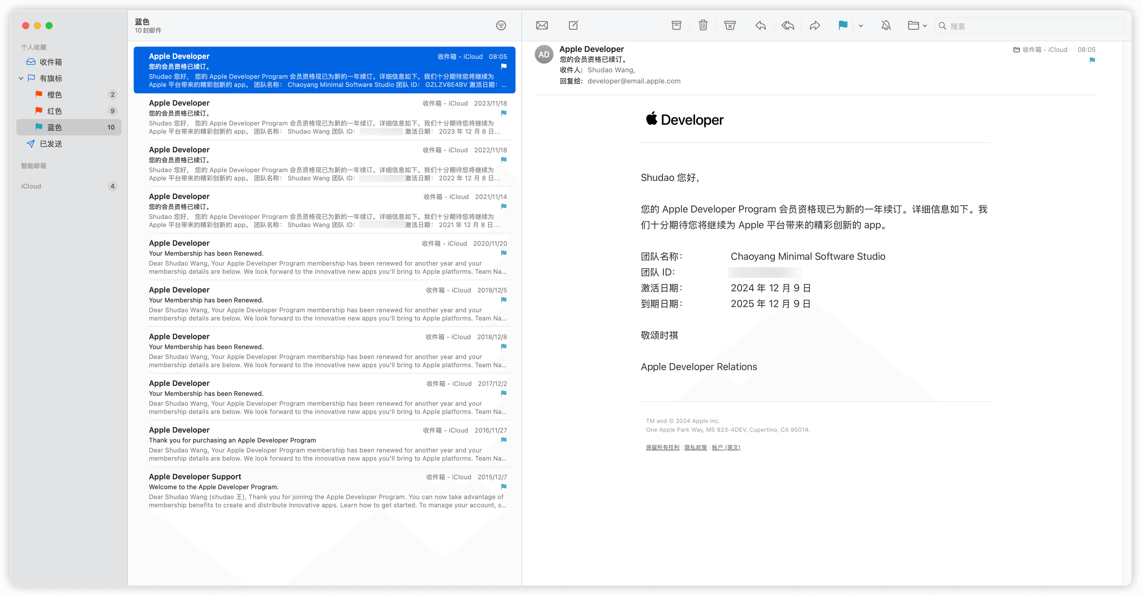 周日早上,收到了苹果开发者会员自动续订的邮件,数了一下,这是第十次交费了,也就是说,我作为苹果开发者进入了第十个年头,也就是灵活就业的第十年。
