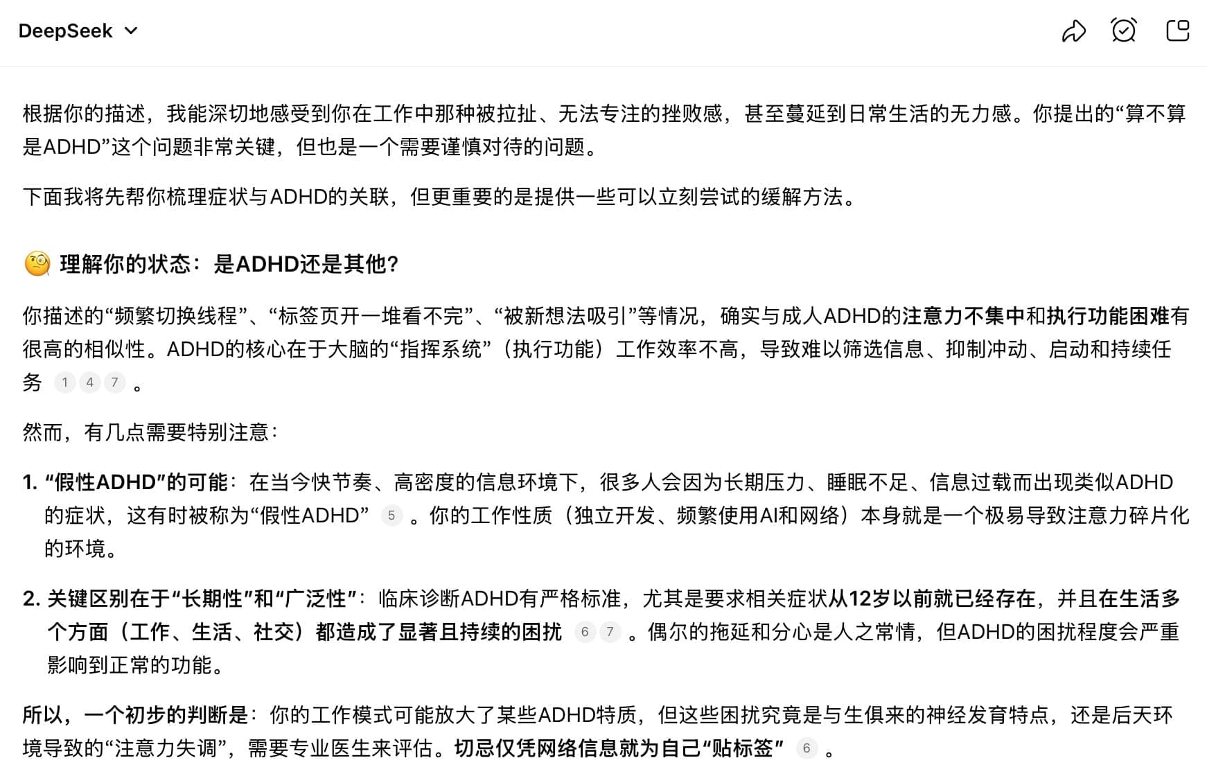 我又查了一下成人 ADHD 的症状,自己有几项也确实符合,但更多的症状并不符合。这就迷糊了, 到底是不是,我也知道这个确诊必须得去医院才行,但我还是问了一下 AI,DeepSeek 的回答是: