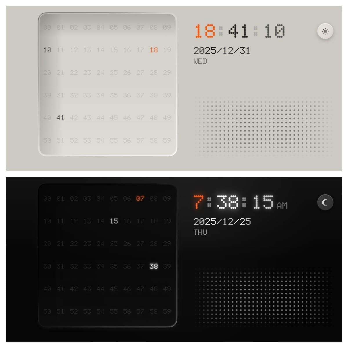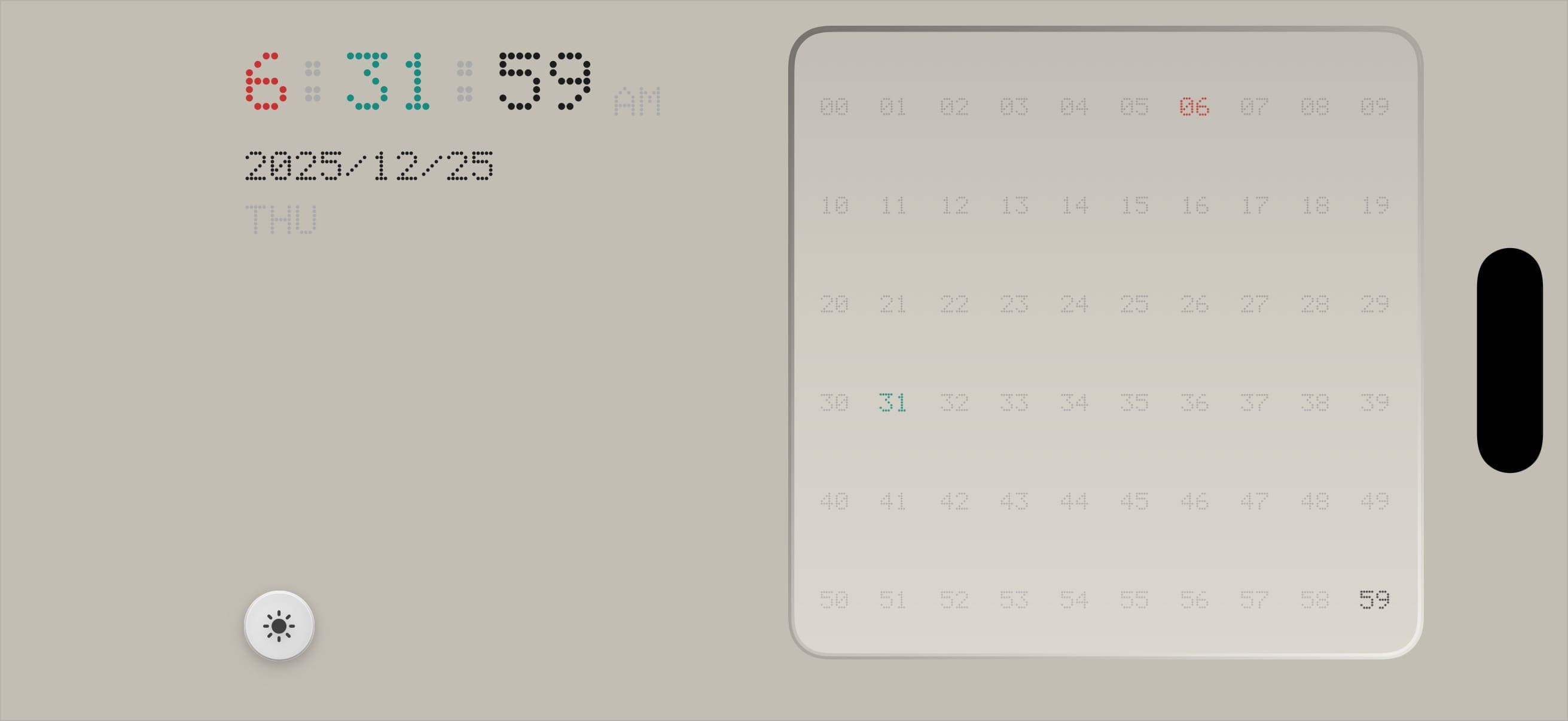 整体布局看起来更极简了,但是还有三个问题,一是横屏下中间这个数字面板又长又扁,二是日期和时间离得太远了,三是浅色模式太刺眼了。于是又大改了整体布局,横屏下分为左右两部分,左边显示时间、日期和按钮,右边显示数字面板。另外浅色配色采用了更复古的方案,为了更好地区分小时和分钟的数字,我将二者的显示颜色换成了对比强烈的红色和绿色,如下图所示。