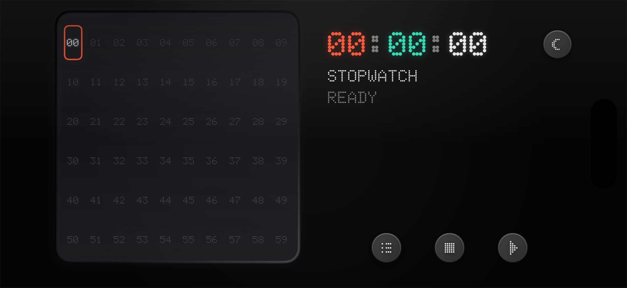 相较于简单的时钟页面,计时器页面有额外的标题、状态和三个控制按钮。标题(如 POMODORO)和状态(如 PAUSED)可以直接复用日期和星期的文本位置,但三个控制按钮的布局却成了难题,如果和模式切换按钮一样都摆在底部,显得太拥挤了。于是我就做了很多改动,如下图所示: